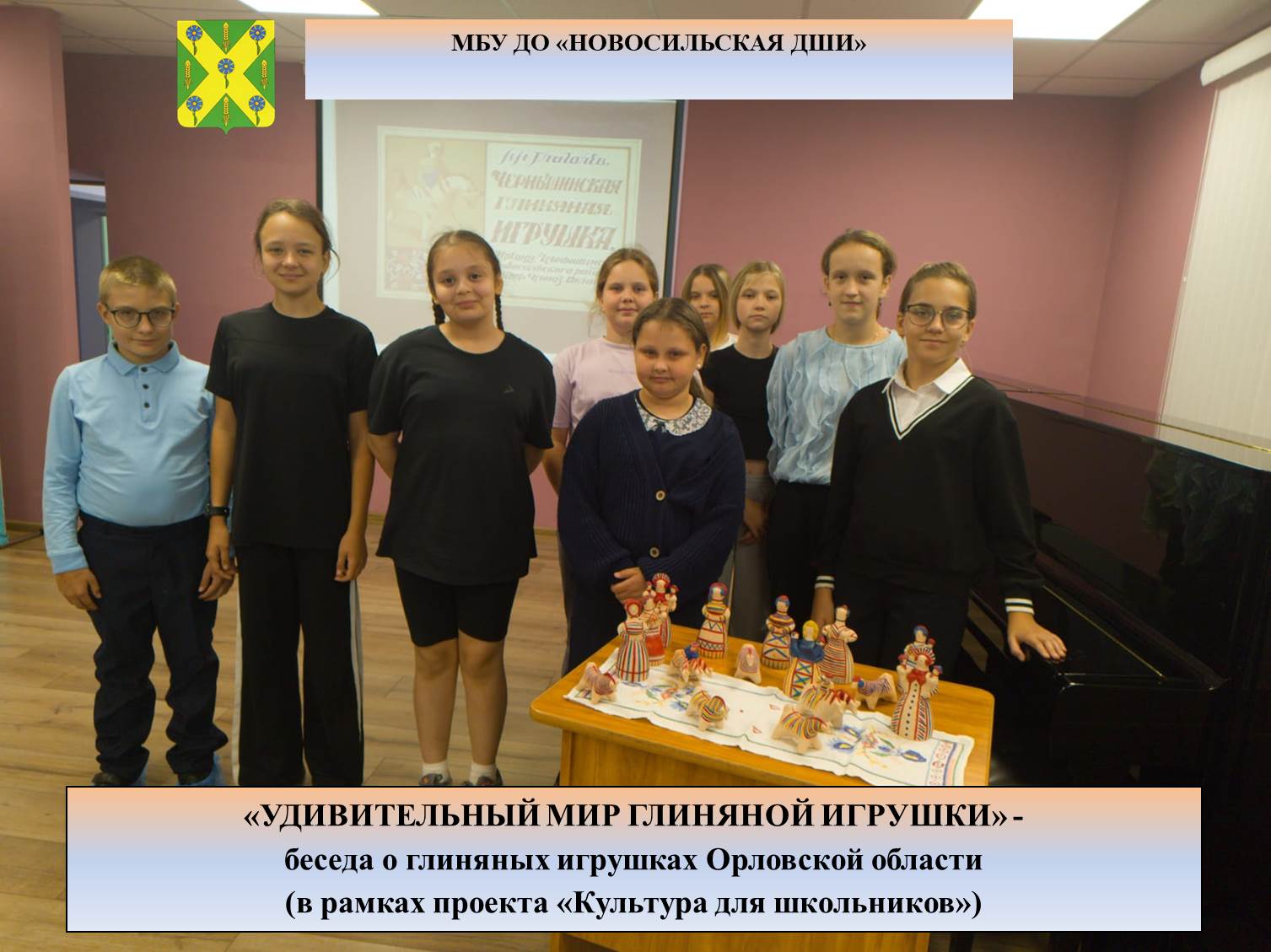 В рамках проекта «Культура для школьников» преподаватель ДПИ Чибисова Н.В. познакомила обучающихся 1 и 2 классов художественного отделения МБУ ДО «Новосильская ДШИ» с двумя древнейшими игрушеными промыслами Орловской области – Плешковским и Чернышинским. Обучающиеся узнали о видах глины, которые используются в каждом промысле, способе лепки, обжиге и тонкостях росписи игрушек. Плешковская и Чернышинская игрушки очень похожи между собой по способу лепки и сюжетам. А произошло это потому, что игрушки рождались в труде, и известный мастер и простой крестьянин учились у одного великого мастера — природы.