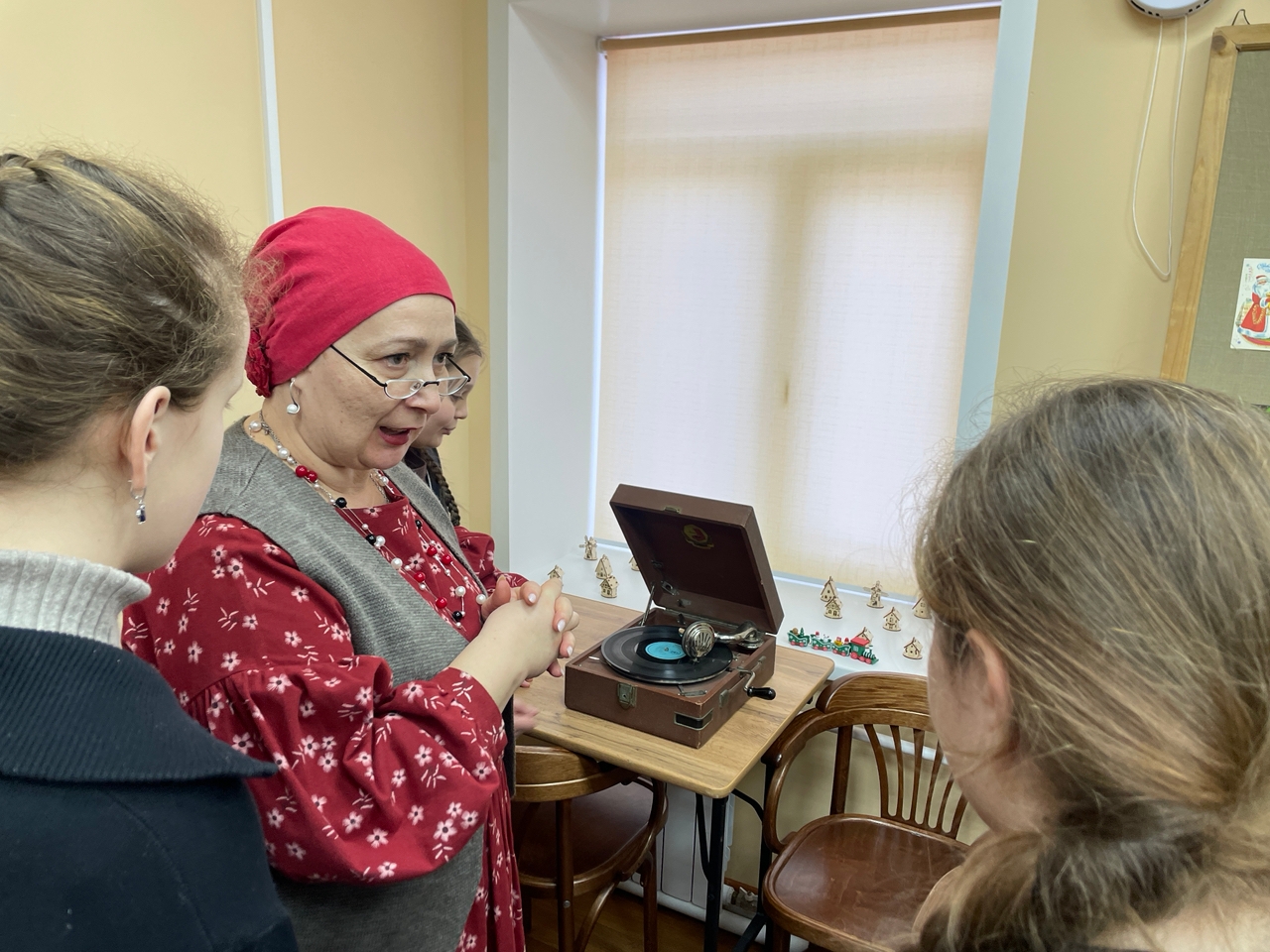 Ещё одним запоминающимся «экспонатом» стал момент живого звука. Сотрудники музея подготовили для ребят особый сюрприз — проигрывание легендарной песни «В лесу родилась ёлочка» на настоящем патефоне. Для детей это было первое знакомство с механическим чудом прошлого.